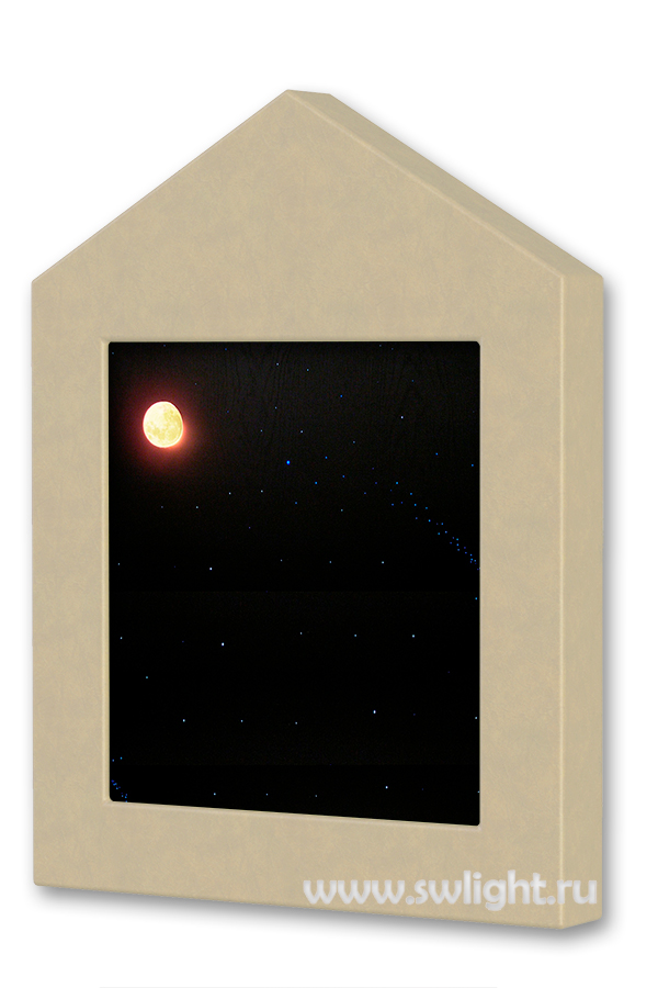Мягкая настенная интерактивная сенсорная панель, имитирующая звездное небо со светящейся Луной в виде подсвеченного слайда и плывущими на фоне Луны облаками. Мерцающие звезды.
