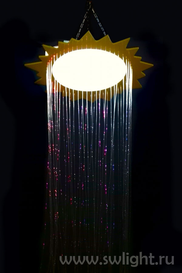 Фибероптический душ «Солнышко» имеет оригинальный дизайн. Подвесная платформа выполнена в виде светящегося Солнышка с ярко-желтыми лучиками. В продолжение лучиков выведены светящиеся нити, которые свисают вниз и искрятся разными цветами. Подвес к потолку.