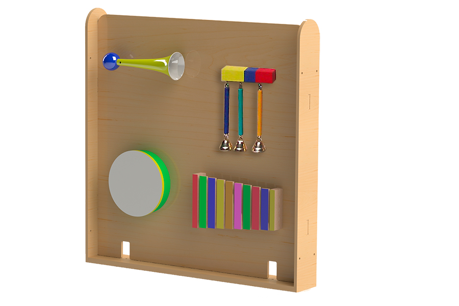 На панелях крепятся элементы разнообразной тематики (музыкальные, механические, тактильные, световые, оптические и т.д.).